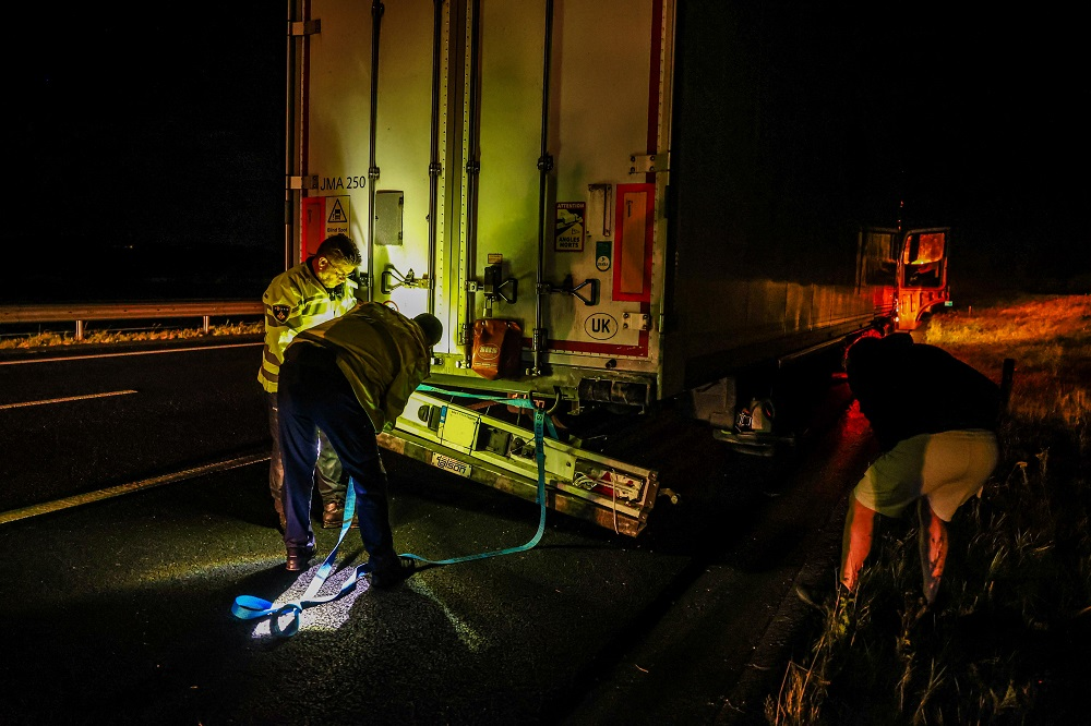 De vrachtwagen liep schade op aan de bumper, die ter plaatse werd vastgezet zodat het voertuig naar een parkeerplaats kon rijden. De politie onderzoekt de toedracht van het ongeval.