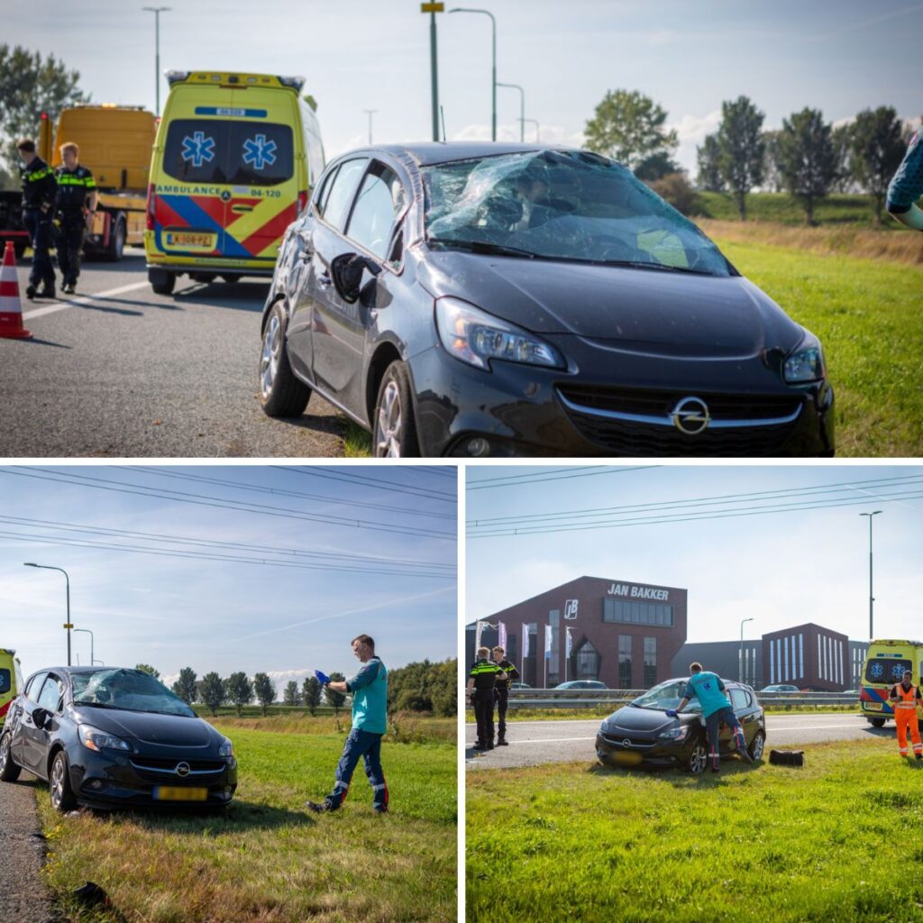Ravage op N214, brokstukken op de weg en auto in weiland
