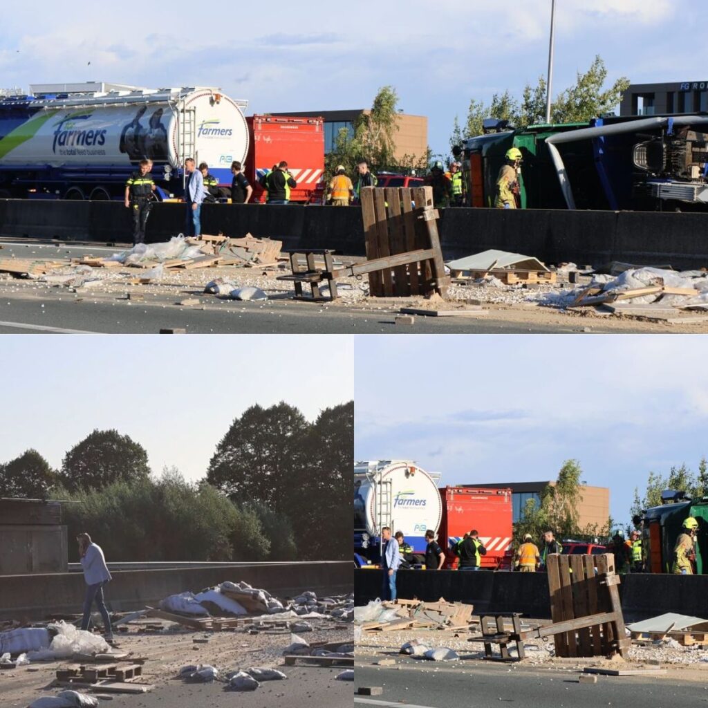 Verder zijn door het ongeluk beidde weghelften beschadigd geraakt en is de barrière in de middenberm verschoven. Inmiddels is gestart met de verloren lading opruimen. Dat verplaatsen zou ongeveer tot begin van de avond duren, verwacht Rijkswaterstaat.