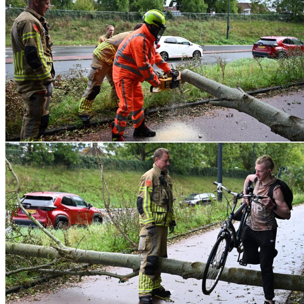 De brandweer heeft de boom in stukken gezaagd en daarmee de weg en het fietspad weer vrijgemaakt. Voor het zover was, moesten fietsers de nodige capriolen uithalen om hun weg te vervolgen.