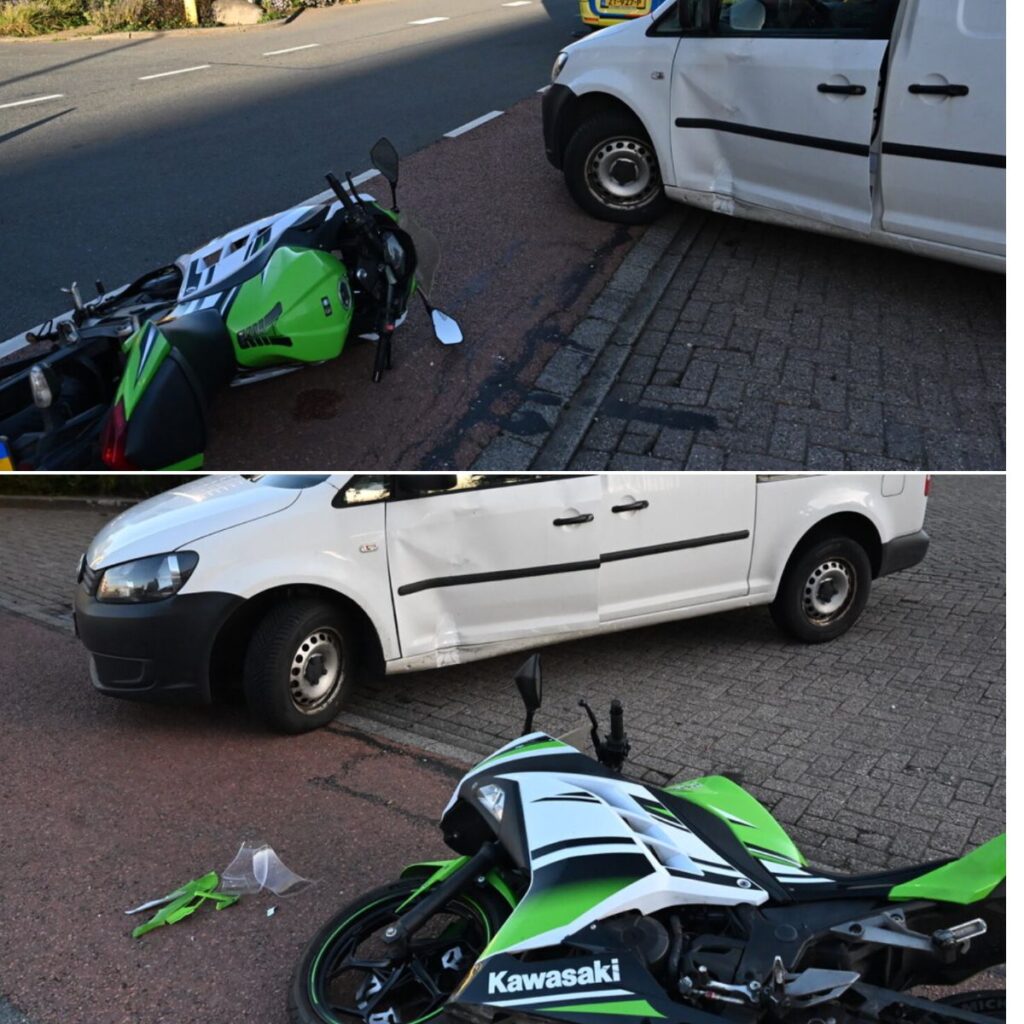 Een bestelauto is dinsdagmiddag gebotst met een motorrijder. Het ongeluk gebeurde bij de uitrit van een bedrijf op de Industrieweg op bedrijventerrein De Grote Polder in Zoeterwoude-Rijndijk.