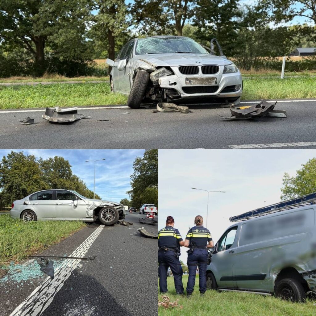 Ravage op N214, brokstukken op de weg en auto in weiland