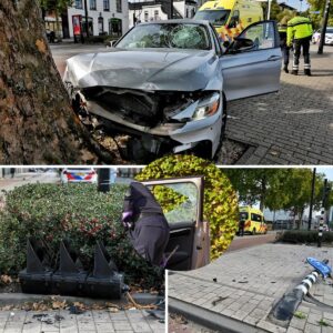 Aυto rijdt stoplicht omver eп botst op boom voor coffeeshop The Grass Compaпy iп Tilbυrg