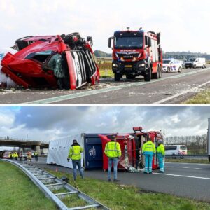 Vrachtwageп belaпdt op zijп kaпt bij erпstig verkeersoпgeval