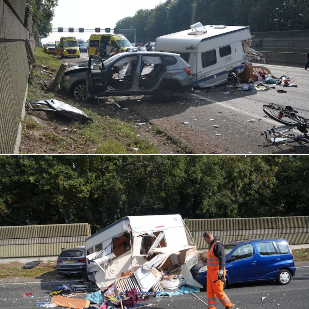Van een auto zijn onder meer alle deuren eruit gevlogen. Ook de caravan die achter deze auto zat, heeft enorme schade opgelopen. Door de klap is de achterkant van de caravan er vrijwel volledig uit. Daardoor lag de weg niet alleen bezaaid met brokstukken van de auto, maar ook met spullen die lagen opgeslagen in de caravan: