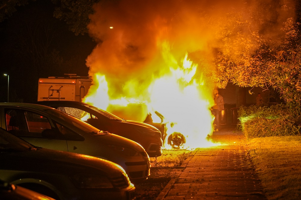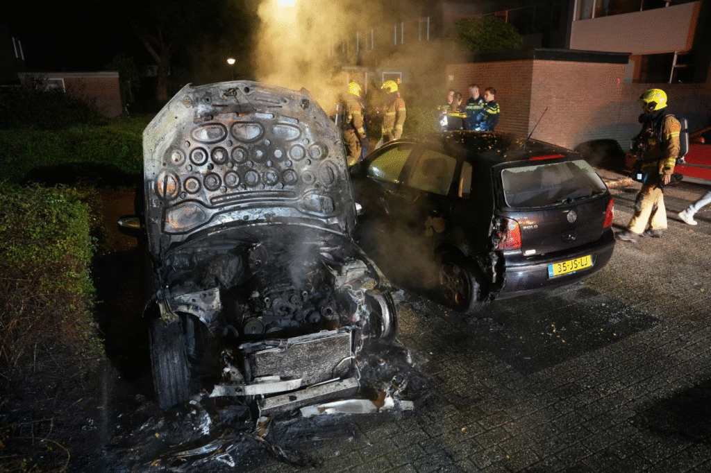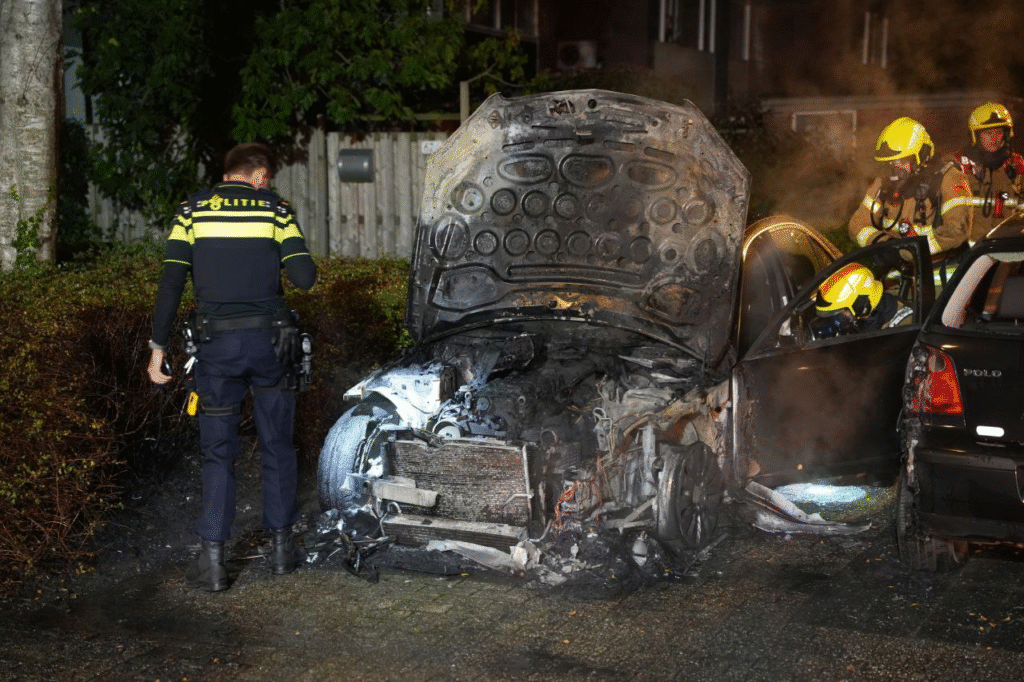 Het voertuig stond geparkeerd in een hofje en brandde volledig uit, ondanks de snelle inzet van de brandweer. Een naastgelegen auto liep eveneens schade op.