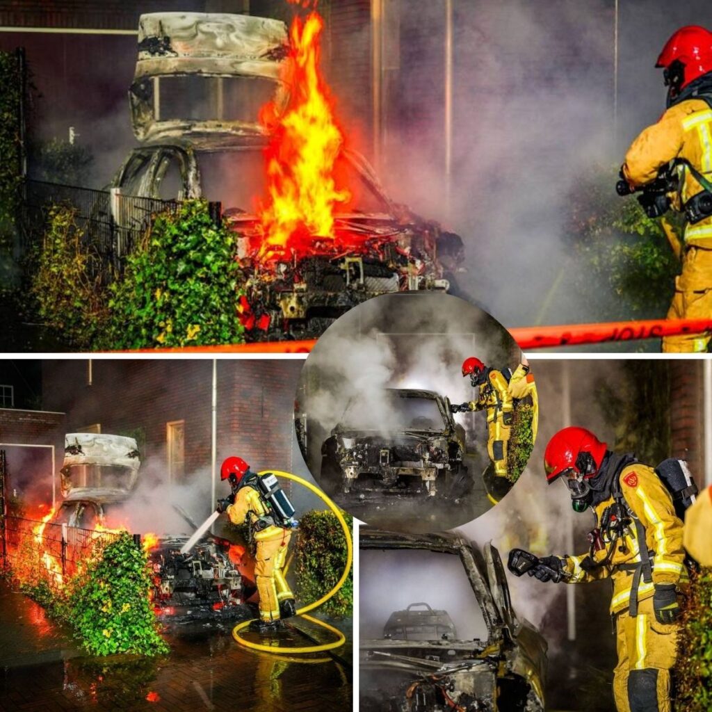 De brandweer werd in eerste instantie opgeroepen voor een woningbrand, maar toen zij ter plaatse kwamen rond kwart voor drie stond een elektrische auto in lichterlaaie op een oprit naast een huis.