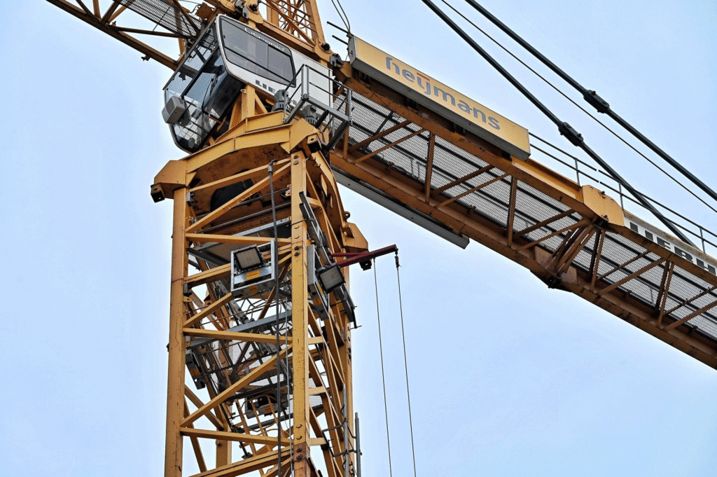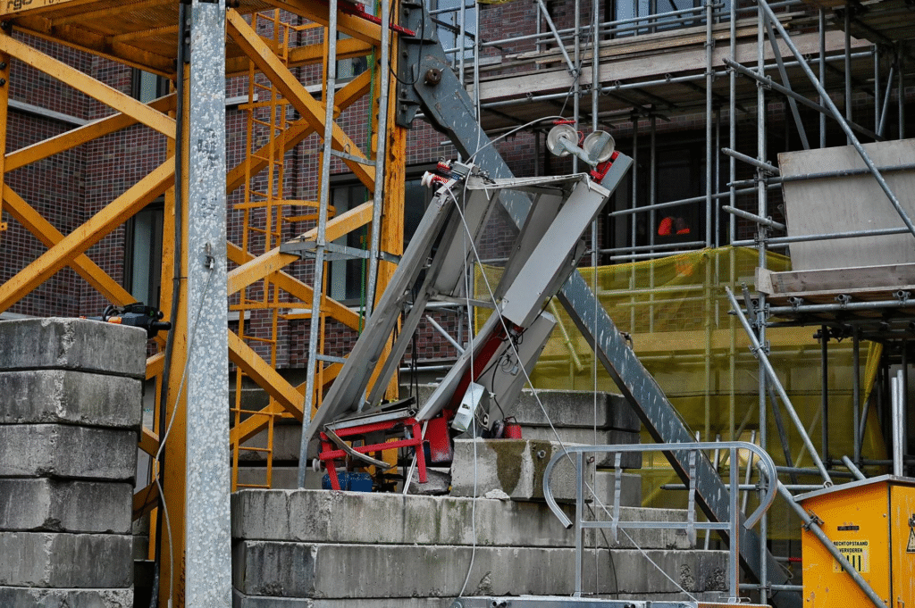 De lift van een torenkraan viel daar ongeveer zestig meter naar beneden terwijl de man erin zat.