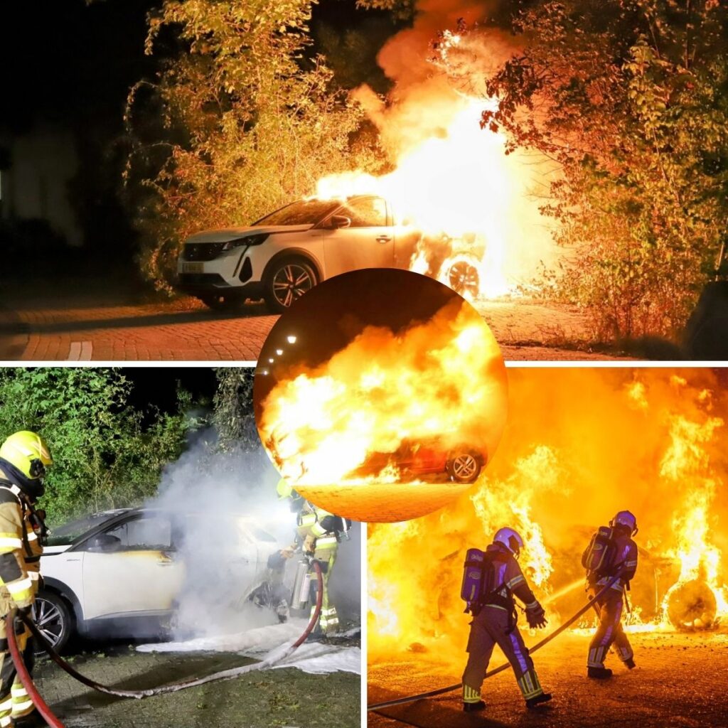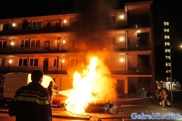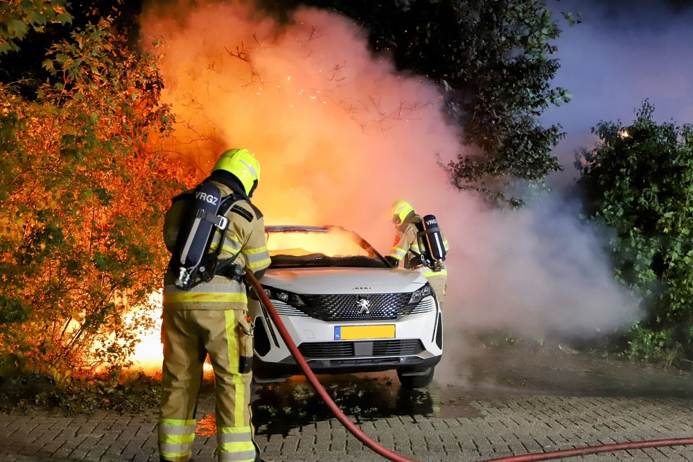 Bij aankomst stond het voertuig al volledig in brand, met metershoge vlammen en een flinke rookpluim.