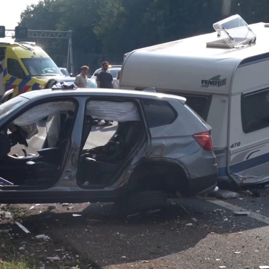 Het ongeluk gebeurde rond 14.15 uur. Volgens De Stentor botste een auto met caravan tegen een geluidswal, waarna een andere auto vol op de caravan knalde. De klap veroorzaakte een enorme ravage: deuren van een auto vlogen eruit, de achterkant van de caravan lag volledig open en de snelweg kwam bezaaid te liggen met brokstukken en spullen.