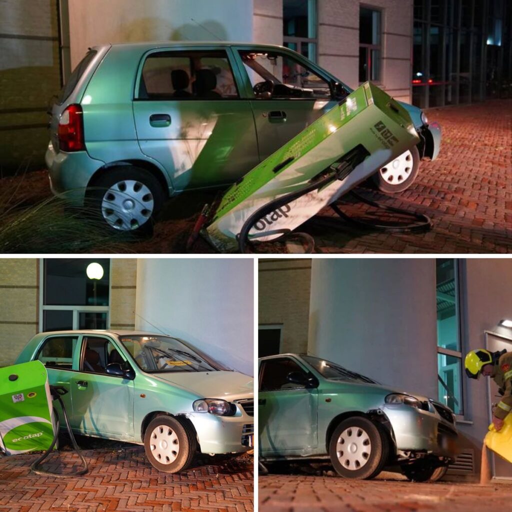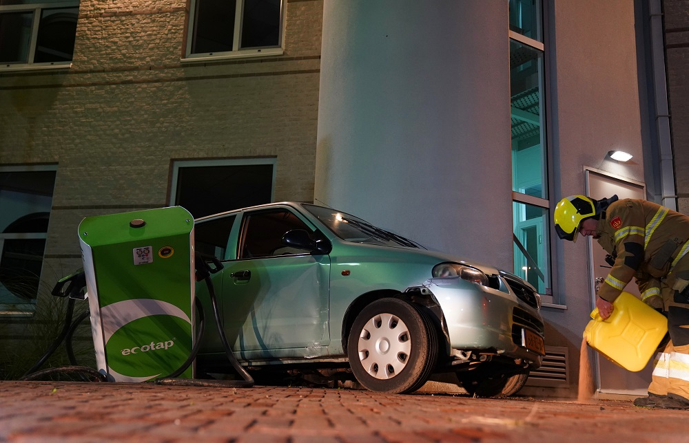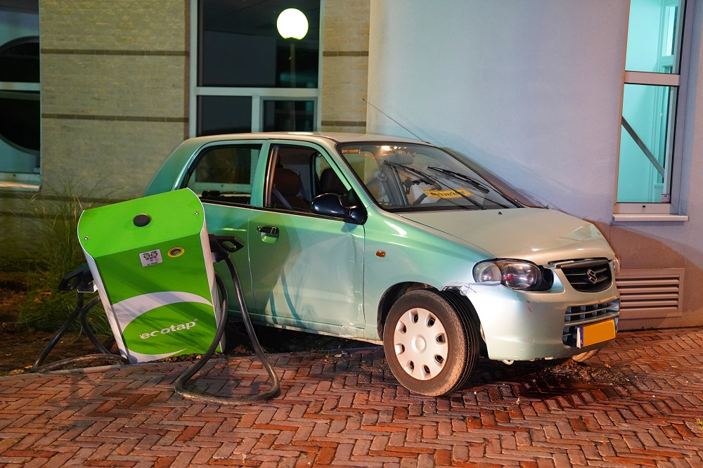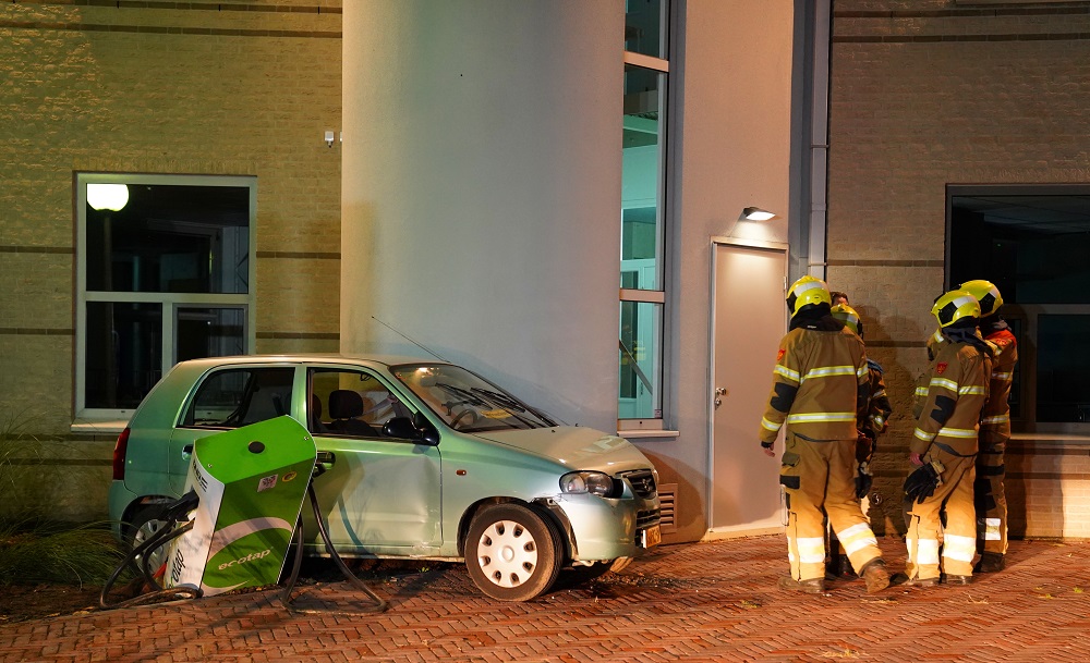 Omdat niet duidelijk was of de laadpaal onder spanning stond, rukte de brandweer uit en werd een monteur ingeschakeld. Nadat het gevaar was uitgesloten, is de zwaar beschadigde auto door een berger afgevoerd. Het voertuig is total loss verklaard.