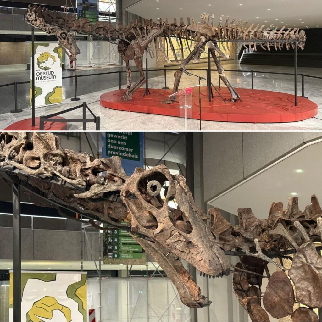 In het provinciehuis in Den Bosch is vanochtend het skelet van een enorme langnekdino onthuld. Het fossiel, dat de naam Aurora draagt, is van het Oertijdmuseum. Het kostte vrijwilligers van het museum zo’n 30.000 uur om het skelet te prepareren en in elkaar te zetten.