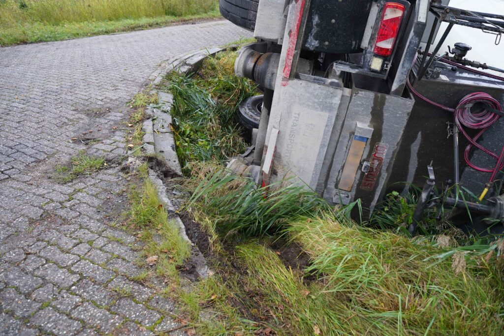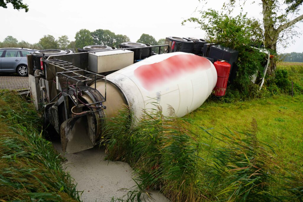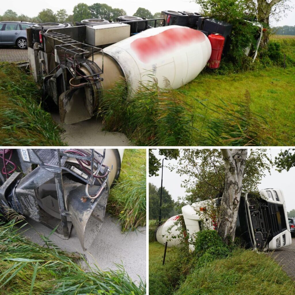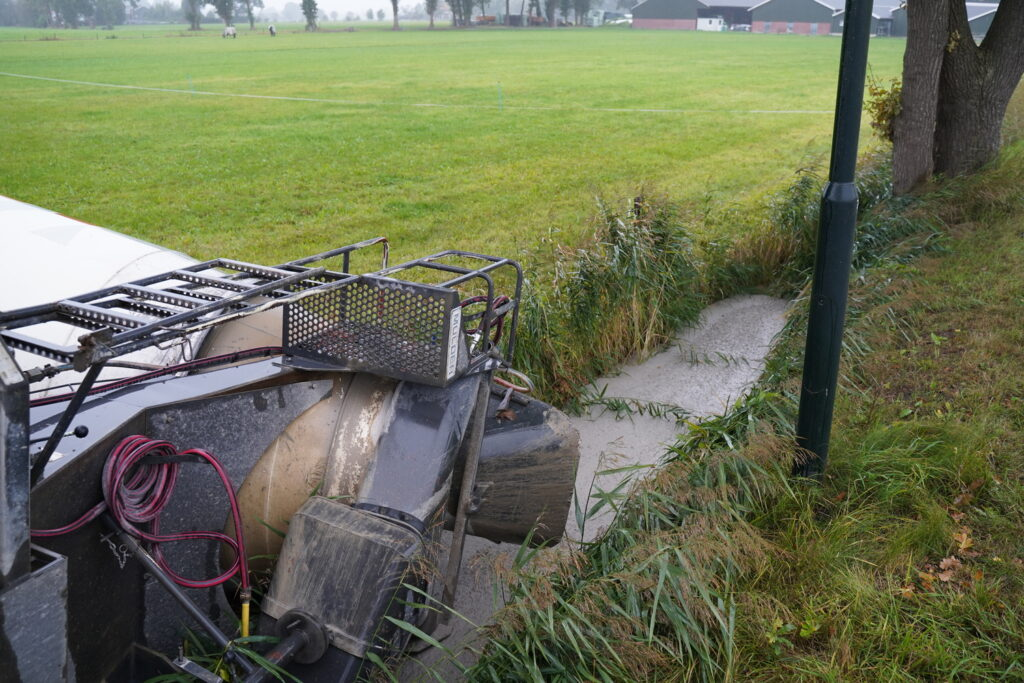 De vrachtwagen was geladen met vloeibaar beton, waarvan een deel in de sloot terecht is gekomen. De chauffeur wist via een trapje de cabine te verlaten en bleef voor zover bekend ongedeerd.
