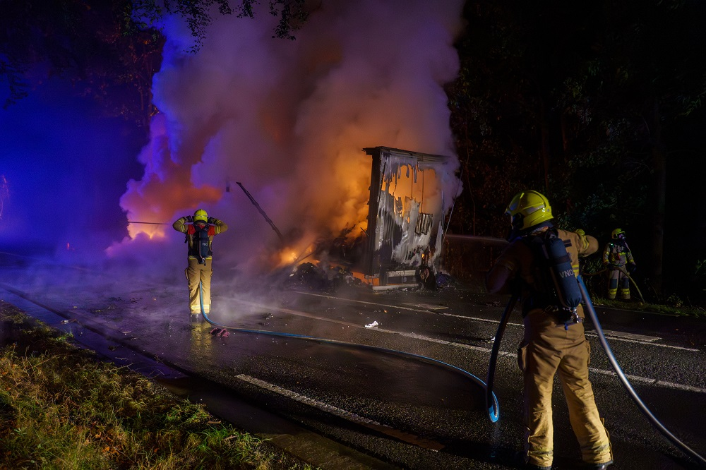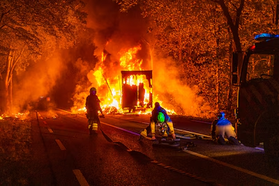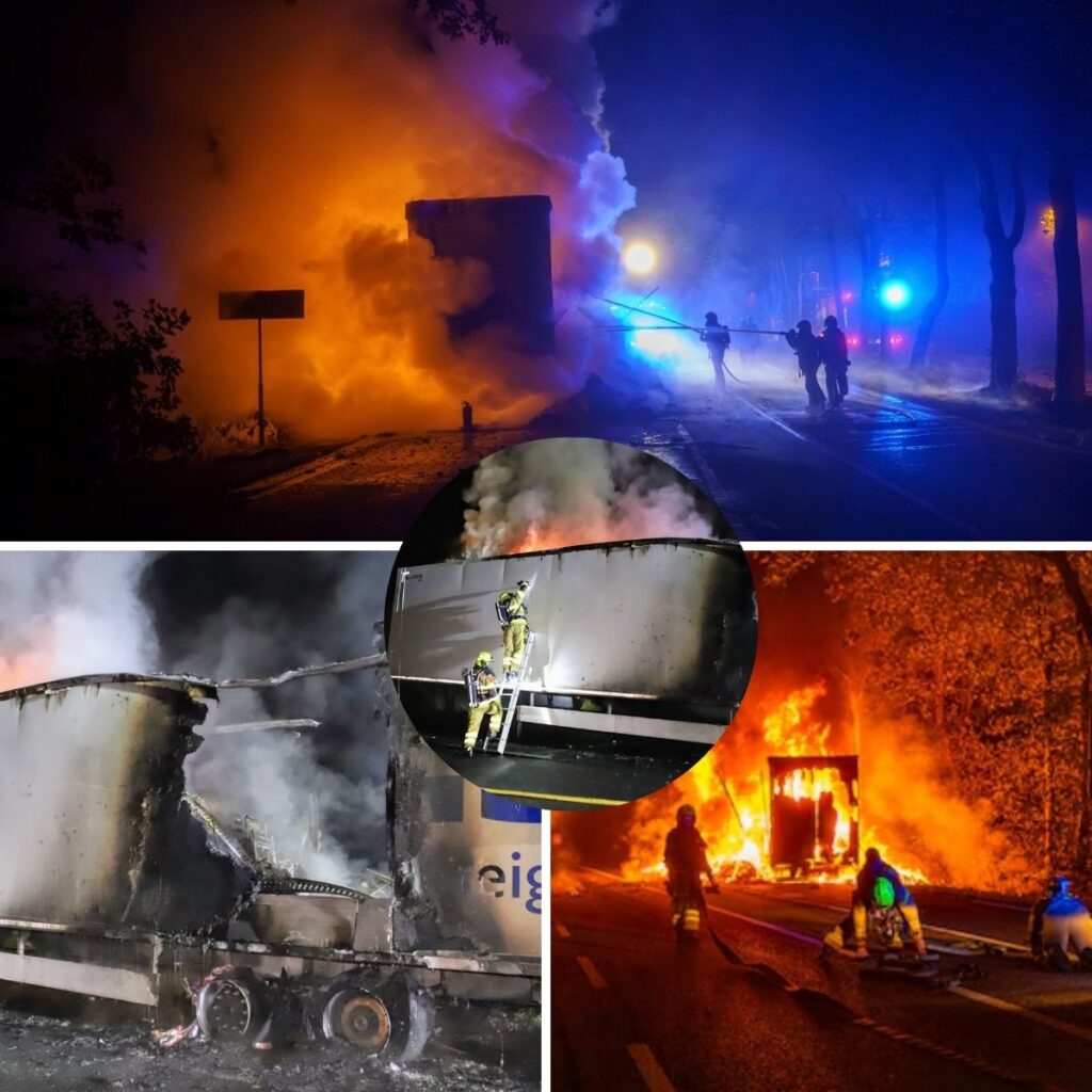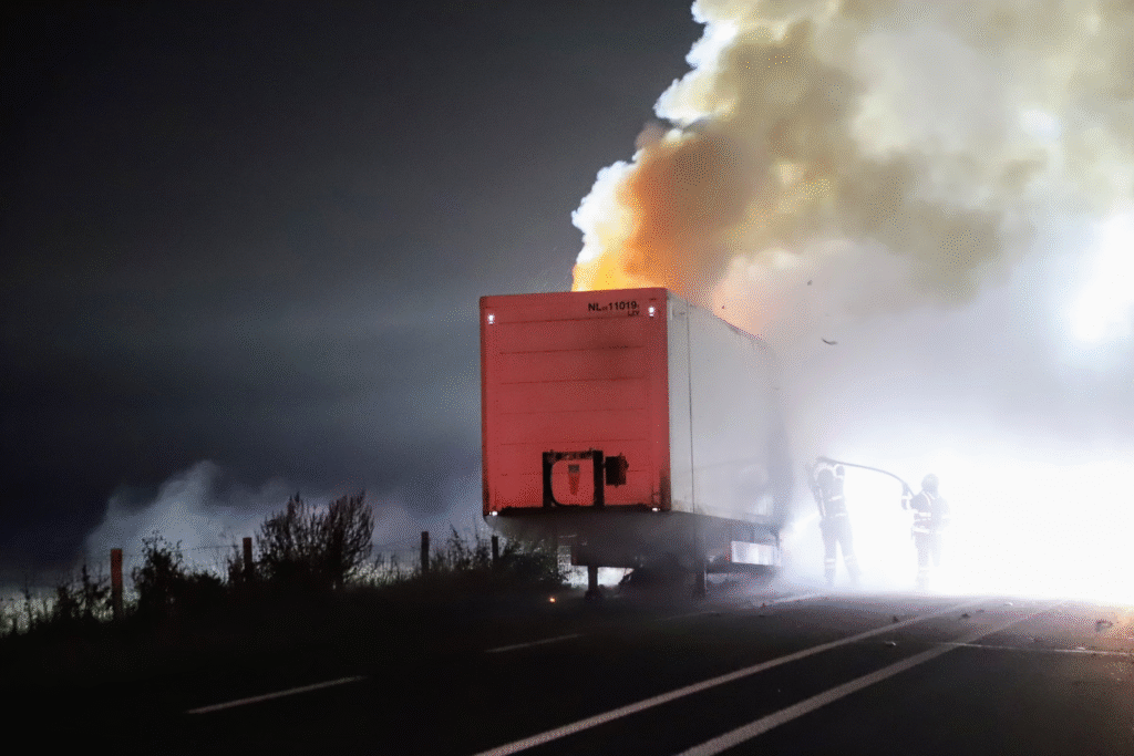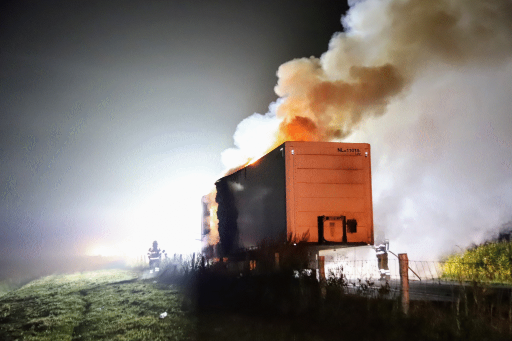 Bij aankomst van de brandweer stond de oplegger al volledig in lichterlaaie.