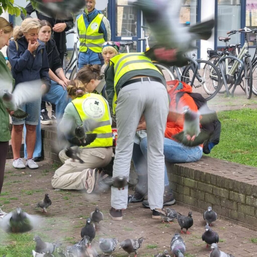 SOS Duif zet zich in voor het verbeteren van het leven van stadsduiven. Door het hele land geven ze workshops en zetten ze vrijwilligersgroepen op die zich hard maken voor de duiven. Dat is ook het doel van Yolanda Hakemelder die hier in Leiden een club aan het opzetten is. Zelf gaat ze al wekelijks op pad. Wie zich wil aansluiten kan contact opnemen via de Stadsduivenhulp Community (Pigeon Rescue NL) op Facebook.