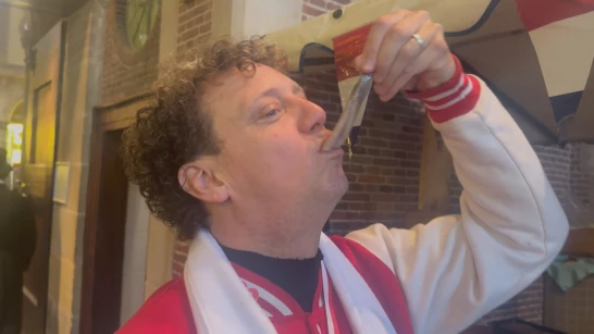 Daarna is het tijd voor het uitdelen van haring en wittebrood in De Waag aan de Aalmarkt. ‘Ik sta hier al sinds 7.00 uur. Eerst hebben we lekker gezongen en nu staan we in de rij’, zegt een jonge man met een rood-wit shirt. ‘Ik woon al negen jaar in Leiden, dus we doen lekker mee.’